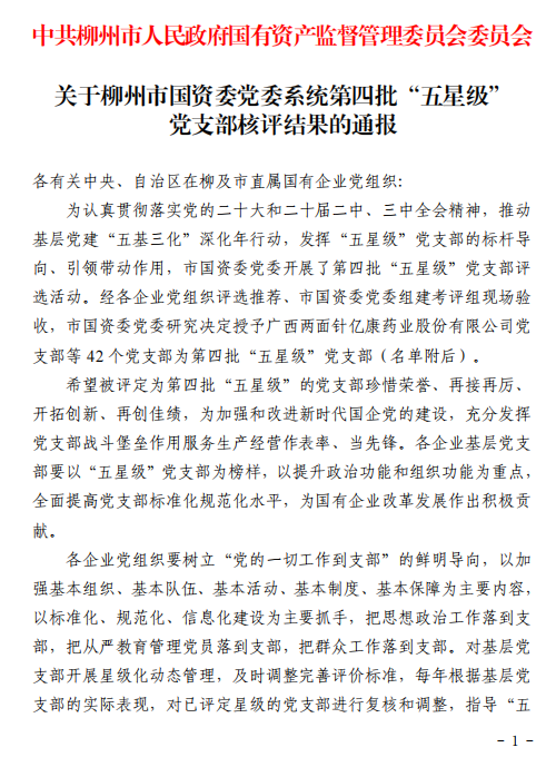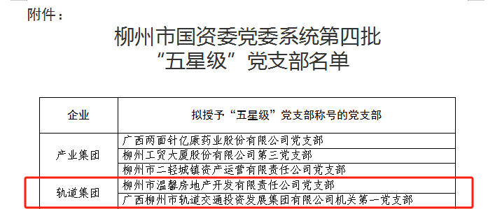 近日,柳州市國資委發(fā)布了《關于柳州市國資委黨委系統(tǒng)第四批“五星級”黨支部核評結果的通報》,柳州市溫馨房地產(chǎn)開發(fā)有限責任公司黨支部、廣西柳州市軌道交通投資發(fā)展集團有限公司機關第一黨支部榮獲柳州市國資委黨委系統(tǒng)第四批“五星級”黨支部榮譽稱號。